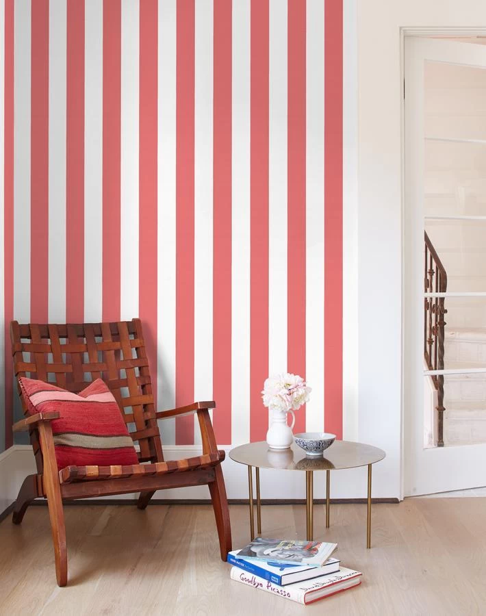 Brighten up a bedroom with one of our striped wallpapers ready for summer with a selection of warm summer colors such as creamsicle, rose, storm, watermelon, lapis or lime. Wallshøppe’s Candy Stripe wallpaper collection includes 18 bold color ways for a contemporary home aesthetic. Our striped wallpaper panels can be hung vertically or horizontally, this choice is easy. Combining a bold color striped wallpaper next to a solid color statement wall is sure to transform any living room or dining room into a chic modern living space.