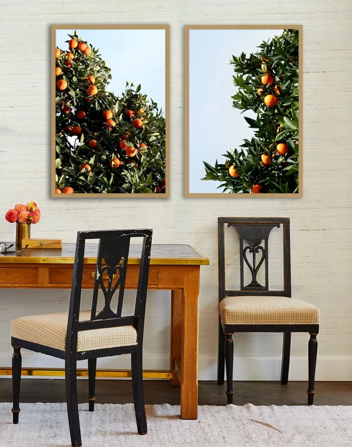 A photographic escape to the orange groves of Ojai. Our Orange Tree photograph is printed on matte paper and framed with a natural woodgrain frame.