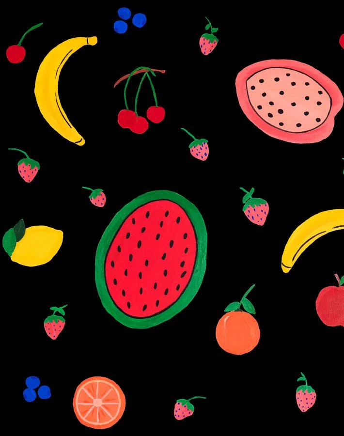 Our Fruit Punch wallpaper is bunches of fun with hand-painted cherries, bananas, melons and strawberries. Mix it up with this wallpaper, perfect for your playroom or kitchen in a matte black colorway.