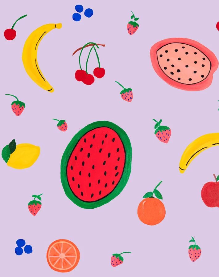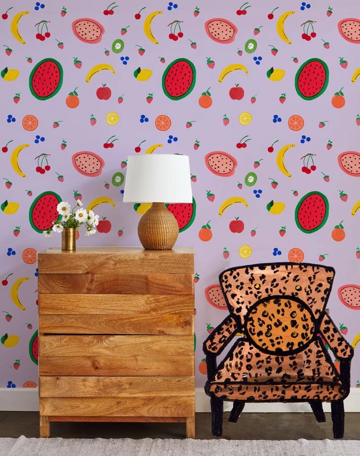 Our Fruit Punch wallpaper is bunches of fun with hand-painted cherries, bananas, melons and strawberries. Mix it up with this wallpaper, perfect for your playroom or kitchen in a lily lavender colorway.