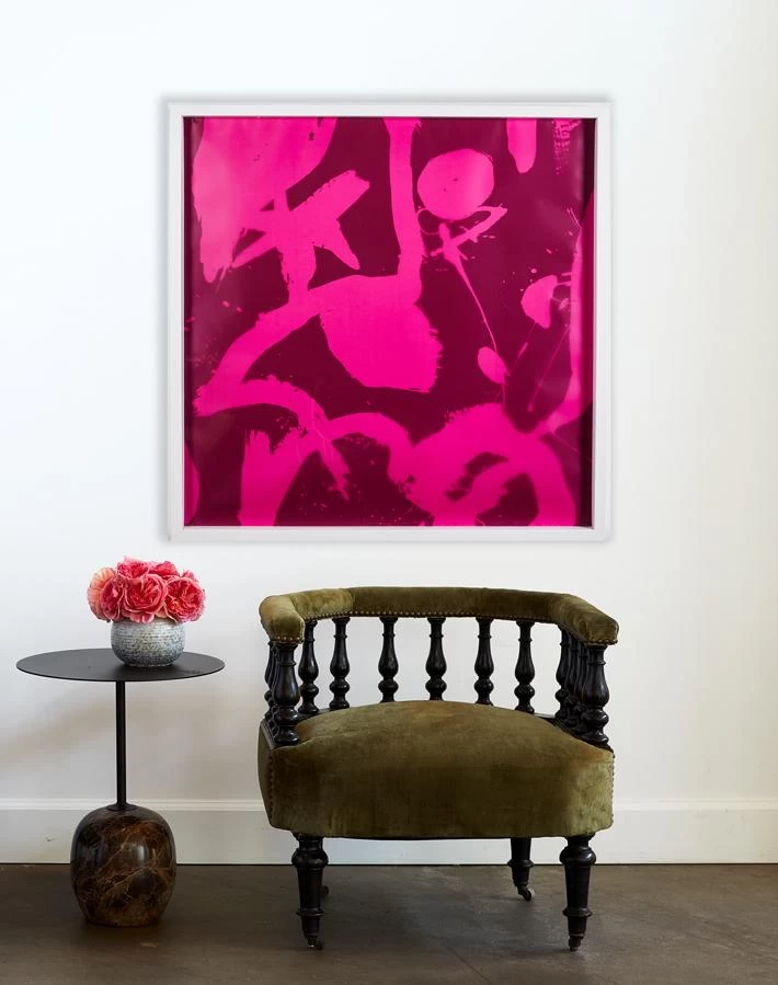 Fashion designer Chris Benz took a surrealist spin on color with this Miro inspired illustration. This unique piece is printed on vellum which is then layered on a painted mat with artist pins. The crisp white frame accentuates the pop of color and form.