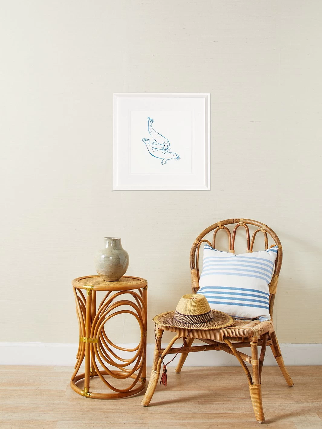 Our ‘Malibu Seals’ framed art is a modern, southern California take on coastal. Soak up the Malibu sun with these playful blue seals and white framed print.
