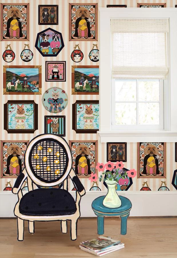 Say hello to your new furry friends with an eclectic gallery wall on our Pet Portraits striped wallpaper. This pattern showcases the artist’s signature style with each pet portrait and their unique characteristics fantastic painted frames.