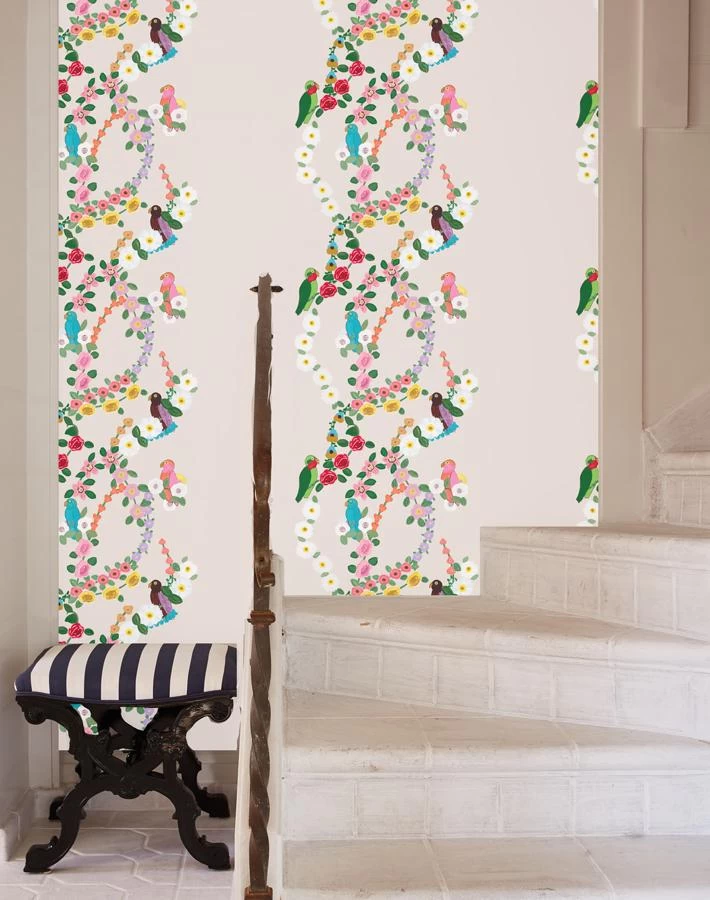 Our Rainbow Garden Stripe, full of blissfully colored flowers and magical birds from the tropics will whisk you away to paradise. Created on an oyster off-white backdrop, this delightful wallpaper pattern will make your bedroom or apartment entryway truly memorable.