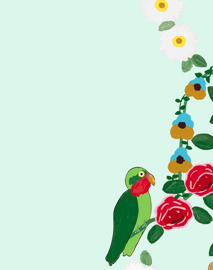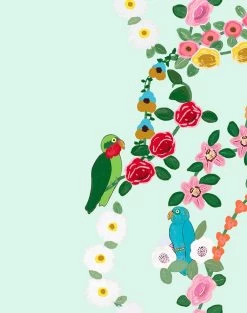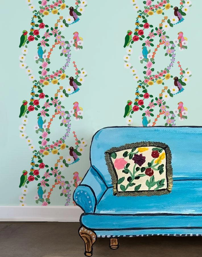 Our Rainbow Garden Stripe, full of blissfully colored flowers and magical birds from the tropics will whisk you away to paradise. Created on a minty robins egg backdrop this delightful wallpaper pattern will make your bedroom or apartment entryway truly memorable.