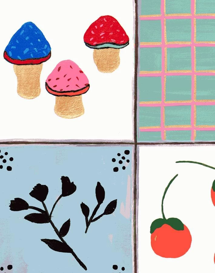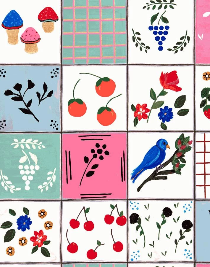 Our super fun Topo Tile wallpaper uses vivid colors and lighthearted imagery to tell an eccentric story in each square. Your walls will never feel more lively with this cheery grid pattern.