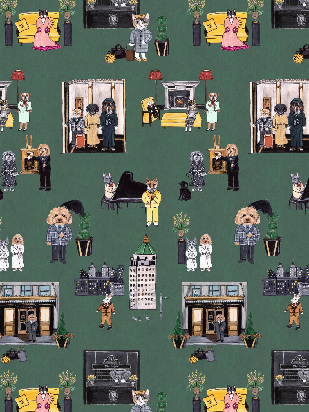Featuring the most whimsical & sophisticated pets we have ever met, Carly Beck’s newest wallpaper design is inspired by The Carlyle. Whether enjoying a spa day, hailing a cab, or just looking fabulous in the lobby, these cute characters make for the perfect conversation wallpaper. Shown here in a rich green.