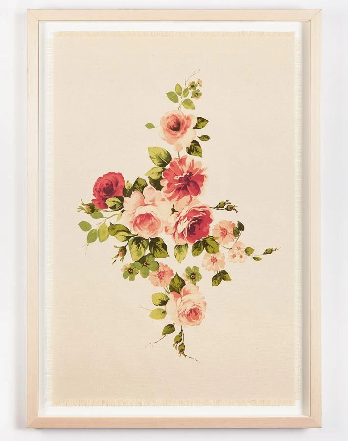 Inspired by vintage French goblins that you would find in Parisian Flea Markets, Maggie May Pink is printed on raw canvas with hand frayed edges. This delicate piece is hand sewn to a natural mat with wood framing. Perfect for a vintage inspired, collected & curated gallery wall.